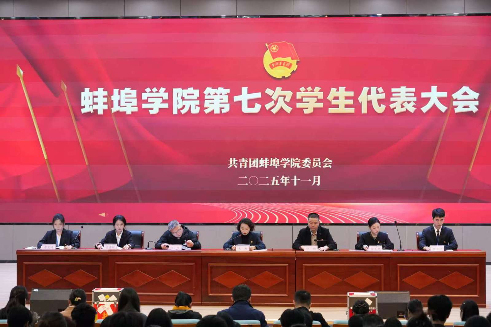 11月15日,蚌埠学院第七次学生代表大会在学术报告厅隆重召开。来自各二级学院187名正式代表、第六届学生会委员会委员参加了会议,各二级学院团委负责人及校团委全体人员出席了开幕式,校团委副书记任旭主持大会。