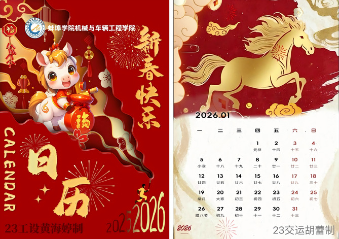 为进一步弘扬中华优秀传统文化,丰富校园文化生活,激发学生的创新设计思维与实践能力,蚌埠学院机械与车辆工程学院面向全院学生开展了“一月一忆” 文创日历海报设计大赛。经过作品征集、专业评审与成果转化等环节,本次大赛的优秀作品已集结成系列文创日历,充分展现了学院学子的匠心与青春风采。